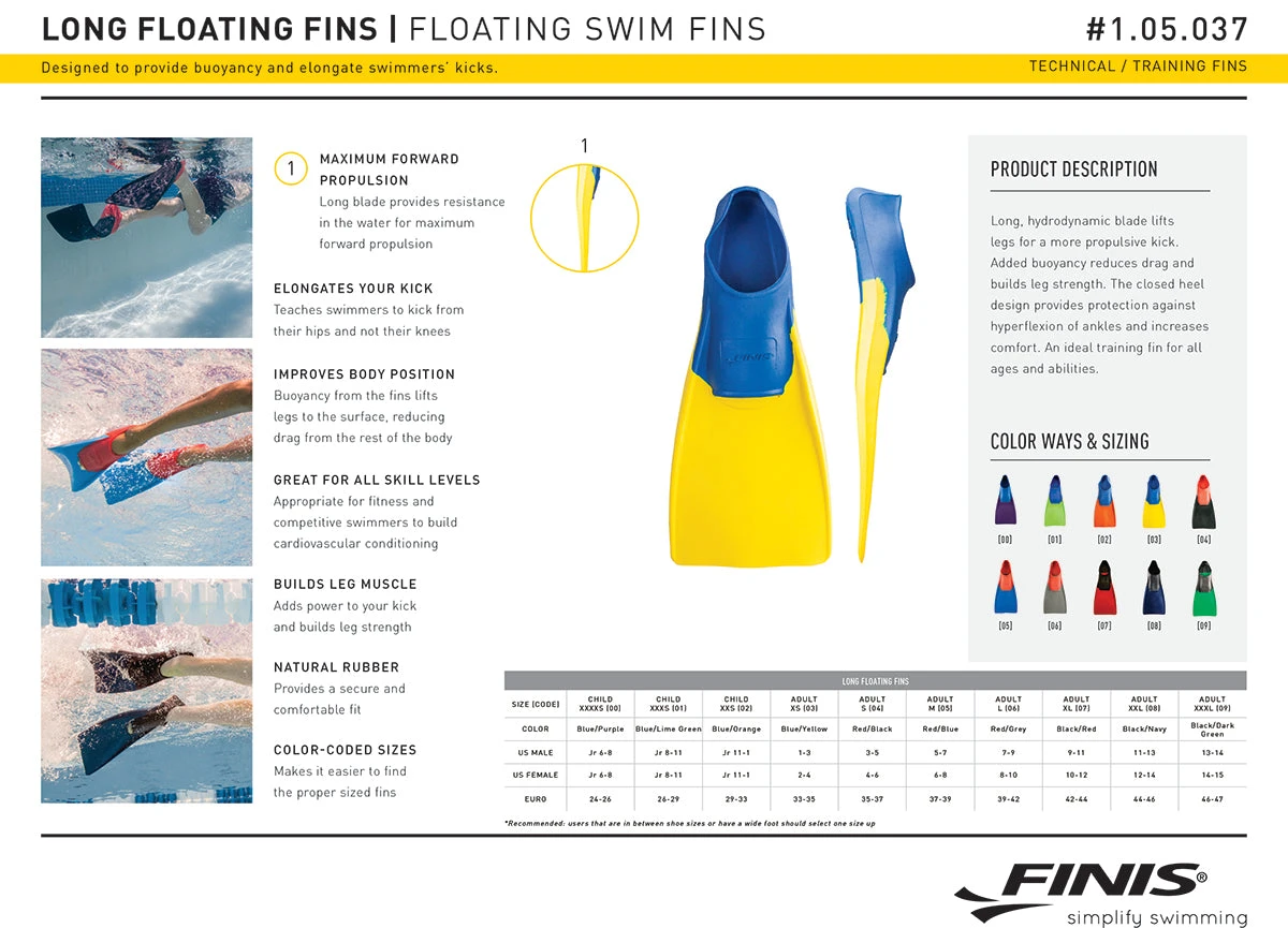 The Finis Long Floating Fins are great for swimmers of all ages and abilities. Designed with a long, rubber blade to provide maximum buoyancy and forward propulsion. The Long Floating fins lift your legs to the surface of the water, reducing drag and improving body alignment. Feedback from the fins teaches you how to elongate your kick by kicking from the hips and not the knees.